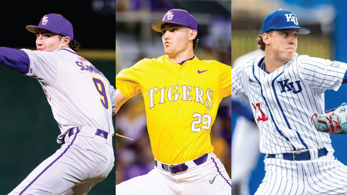 LSU weekend starting pitcher candidates from left are sophomore William Schmidt, sophomore left-hander Cooper Williams and junior senior Kansas transfer Cooper Moore. (LSU photos).