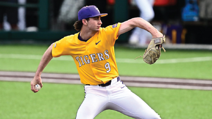 LSU starting pitcher William Schmidt pitched well Sunday before leaving the game in the 5th inning with back tightness. (LSU photo).