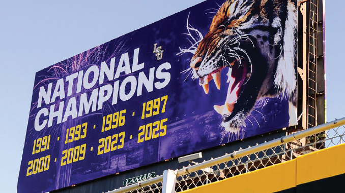 On Wednesday morning, LSU unveiled the updated “Intimidator” sign above right field at Alex Box Stadium with the latest national championship represented from 2025.