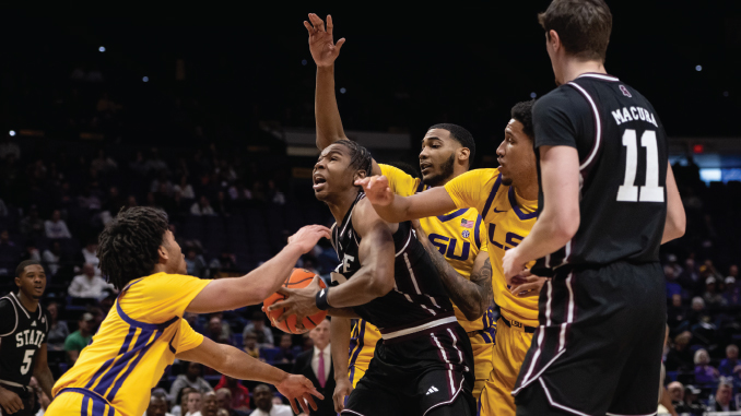 LSU hit just 2 of 8 free throws in the first half while missing 9 of 10 from three-point range. Amazingly, the Tigers had seven consecutive stops over the final minutes of the first half, but were able to finish the half on only a 4-0 run to cut State’s lead to 44-21.