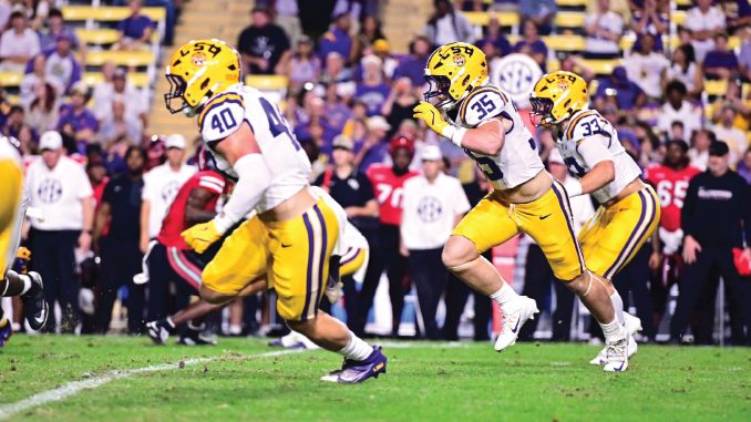 The Weeks brothers – linebackers West, Whit and Zach – became the first trio of brothers to share the field at the same time in LSU football history after the they played next to one another for the entirety of the Tigers’ third defensive series of the game.